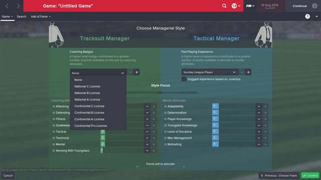 Sebelum distribusi poin untuk memilih atribut pilihanmu, kamu akan diberi pilihan yang bernama Coaching badges dan Past Experience. Dimana intinya, pilihan tersebutlah yang menentukan berapa poin maksimal yang bisa kamu distribusikan ke atributmu nanti. Kamu bisa memilih yang paling ekstrim, seperti tidak mempunyai Coaching badges dan pengalamanmu hanya sebagai mantan pemain Sunday league, atau kalau di Indonesia, bisa kita bilang : pemain liga tarkam. Pilihan manapun yang akan kamu pilih akan memberikan perbedaan total poin sekitar 10-12 poin untuk didistribusikan.