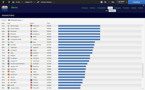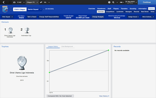 Menurut pengalaman saya bermain FM dengan tim Eropa, saya tidak pernah mendapat budget sedemikian fantastis. Karena inilah saya memutuskan untuk tidak melanjutkan save game ini. Saya mengakhiri karir sebagai tim terkaya ke 74 dunia. Beda tipis dengan Bayern Muenchen.