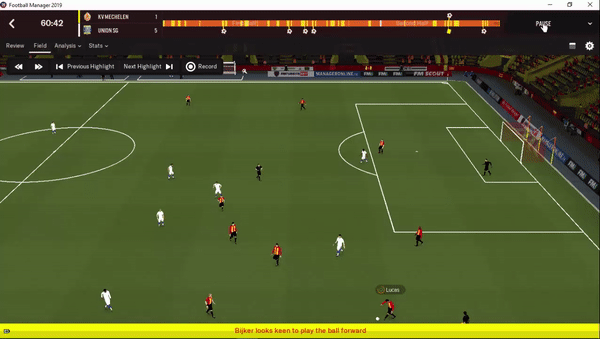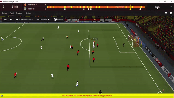 Peran Center Back yang tidak agresif terhadap situasi diatas bisa dilihat di gambar dibawah, dimana CB tersebut memilih tetap menjaga jaraknya dengan di pemain lawan yang membawa bola sambil menunggu support dari pemain lain.