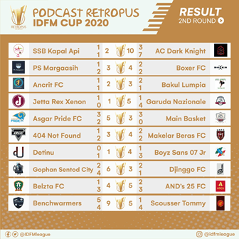 Total ada 16 tim yang memenangkan round 2 ini, termasuk PS Segut Soson Soson yang menang lewat bye. 16 tim tersebut terdiri dari 5 klub dari IDFM Super League yakni Boxer FC, Bakul Lumpia FC, Asgar pride, Benchwarmers dan Sehai United. Kemudian 6 tim IDFM Championship yakni AC Dark Knight, PS Segut Soson Soson, Garuda Nazionale, Makelar Beras FC, Boyz Sans 07 Jr dan Gotir FC. 5 tim sisanya merupakan tim IDFM Championship yang merangkak dari kualifikasi yakni AND’s 25 FC, Gophan Sentod City, Ale Club de Futbol, Kasamu FC, Ventrax FC