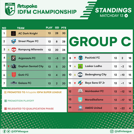 Di grup C, penampilan impresif tak hanya ditunjukan oleh AC Dark Knight sang pemuncak klasmen. Setelah bulan lalu posisinya tergeser oleh Street Player FC, 9 poin yang didapatkan tim berlogo kelelawar sukses menggusur tim berlogo bola tersebut dan memimpin klasmen dengan jarak 2 poin. Komposisi zona promosi yang sebelumnya diisi oleh Pochinki FC terpaksa harus digantikan oleh Gotir FC. Pochinki FC yang bulan Juni hanya memperoleh 1 poin harus puas terlempar dari peringkat 3 ke peringkat 8. Sedangkan Gotir FC mengumpulkan 12 poin, ya benar anda tak salah baca, dan mengangkat posisis Gotir FC dari zona degradasi ke peringkat 6! Tim yang musim lalu hampir promosi ini harus diwaspadai oleh pesaing yang merebutkan zona promosi. Jika lengah, bisa saja tim yang dilatih Muhammad Atir merangsek perlahan ke puncak klasmen
