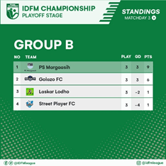 Playoff stage sendiri diikuti peringkat 2-5 dari grup A B dan C untuk memperebutkan 1 slot promosi otomatis ke IDFM Super League musim depan. Pembagian telah dilakukan. Grup A terdiri dari Digital Game FC, PS Segut Soson Soson, Razor Glory dan Ompilnisti Ragazzi. 3 tim pertama yang disebut sudah melalang buana cukup lama di IDFM Championship dan berharap mendapatkan jatah promosi otomatis terakhir, sedangkan nama terakhir merupakan kejutan karena merupakan tim kualifikasi. Digital Game FC berhasil menyapu bersih kemenanangan selama babak playoff group stage dan lolos ke babak final. Digital Game FC berhasil mempecundangi PS Segut Soson Soson dengan skor 2-0, mengalahkan Razor Glory dengan skor 4-1 dan mencukur Ompolnisti Ragazzi dengan skor 4-1. Selisih 8 gol diakhir klasmen menunjukan bahwa Digital Game FC hampir memenangkan pertandingan dengan selisih 3 gol tiap pertandingan.