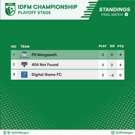 Ketiga juara grup ini dipertemukan di IDFM Championship Final Playoff Stage, yakni PS Margaasih, 404 Not Found dan Digital Game FC. Petualangan dimulai saat PS Margaasih mencukur gundul Digital Game FC dengan skor 4-0. PS Margaasih tertahan imbang oleh 404 Not Found dengan skor kacamata. Kelolosan 404 Not Found sangat bergantung oleh kemenangan atas Digital Game FC dengan skor lebih dari kemenangan PS Margaasih atas Digital Game FC. Namun sayang, 404 Not Found hanya menang 3-1 atas Digital Game FC. PS Margaasih pun dinyatakan sebagai peringkat 1 final playoff stage dan juara 4 IDFM Championship serta berhak atas slot promosi otomatis ke IDFM Super League musim depan.