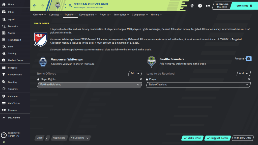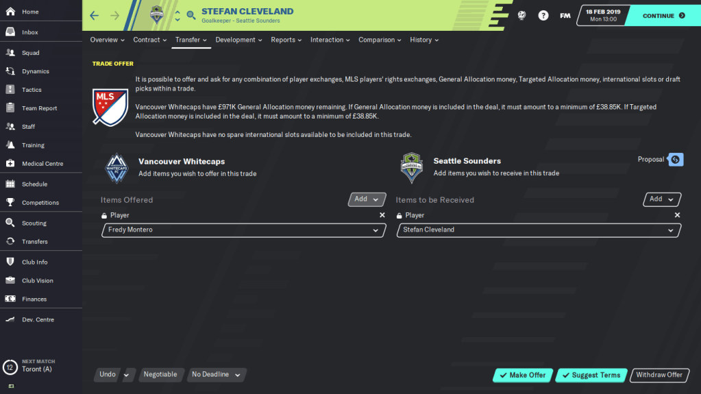 Dan pembahasan terakhir yaitu mengenai trade dan transfer di MLS. Jujur bagi saya, trade adalah hal yang paling sulit saya pelajari selama bermain di MLS. Saya selalu menghindari transfers sesama klub MLS, karena tidak seperti peraturan sepakbola secara general yang menggunakan transfer budget, transfers sesama klub MLS diharuskan melalui trade. Di dalam trade terdapat lima jenis aset yang bisa digunakan untuk trade, yaitu Player, General Allocation Money (GAM), Targeted Allocation Money (TAM), Current Roster, International Slots, Player Right, dan Draft Pick.