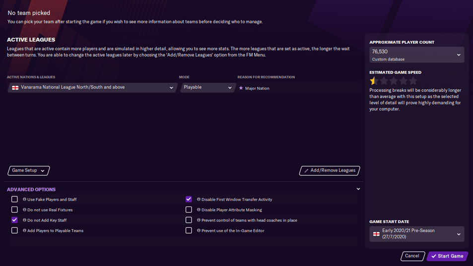 Saya memulai save ini dengan HANYA mengaktifkan satu negara saja, yaitu Inggris, dengan mengaktifkan seluruh liga yang ada, dari Premier League hingga Vanarama Natioanl North/South. Hal ini bertujuan agar proses bergantinya hari bisa berjalan dengan cepat tanpa harus menunggu lama. Sebagai ganti dari liga lain yang tidak saya aktifkan, saya menggunakan opsi custom database untuk tetap mendapatkan real players dari negara lain, khususnya di tim divisi teratas liga-liga eropa.