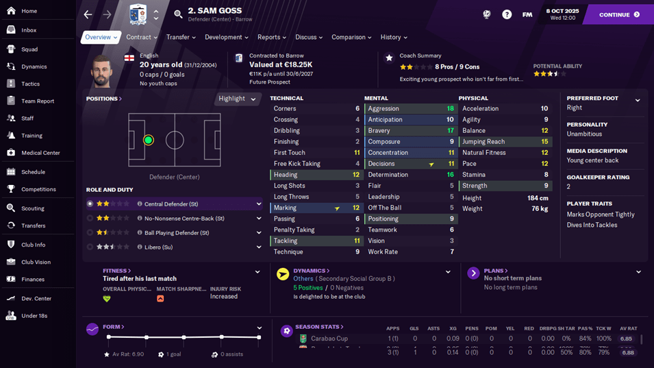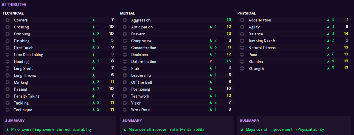 Mereka berdua merupakan angkatan pertama youth intake saya sebagai manajer Barrow. Stats mereka awalnya tidak seperti itu, bahkan Domingos hanya memiliki pace dan acceleration di angka 6 dan 7. Namun dengan (cukup banyak) kesabaran dan latihan,statsnya bisa membaik.saya bukan tipe manajer yang suka mengintip potensi pemain menggunakan Genie Scout atau semacamnya, saya lebih sering mempercayai rekomendasi asisten yang dipadukan dengan insting saya. Dalam kasus Domingos, saya cukup sukses.
