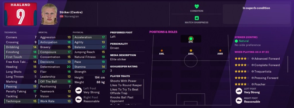 Nama lengkap Erling Braut Håland ini memiliki tinggi 194cm dengan jumping reach 15, menjadikan Haaland adalah opsi yang bagus untuk duel udara, didukung dengan Heading nya berjumlah 15, memiliki efektifitas Header yang cukup oke. Juga dibantu oleh 17 strength dan 17 balance, menjadikan Haaland pemain yang susah untuk diganggu saat duel udara, Dari segi “cepat”, pace 19, acceleration 17, menjadikan Haaland opsi utama para managers yang senang memainkan counter attack cepat, teritama formasi 2 striker, dimana kedua striker memiliki kecepatan yang tinggi untuk mengelabui pertahanan lawan, Haaland juga memiliki atribut off the ball sebanyak 18, off the ball tersebut membantu untuk mencari celah kosong untuk menerima umpan terobosan, flair 16 nya Haaland jg membantu banyak ketika Haaland sedang memegang bola, menjadikan Haaland sedikit unpredictable. Terakhir aspek konsistenisi, determination 20 menunjukkan bahwal Haaland adalah pemain yang pantang menyerah di lapangan, composure 17 membantu Haaland agar lebih tenang di situasi-situas genting, tidak lupa juga Finishing yang berjumlah 18, menjadikan Haaland striker utama yang cukup bisa diandalkan.