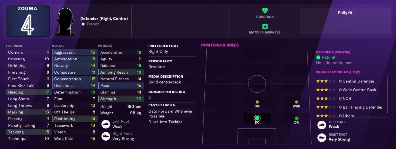 Tinggi 190cm, jumping reach 18, heading 17, balance 19, dan strength 20! Tidak terbayangkan siapa yang lebih superior duel udara nya selain Zouma, lima aspek tadi angka-angka nya hampir sempurna, Zouma sepaket dengan JWP adalah pilihan terbaik untuk mengandalkan sumber gol dari Corner Kick. Zouma juga memiliki acceleration 18 dan pace 15, cukup oke untuk mengejar striker-striker cepat seperti Mbappe, Haaland, Osimhen, dll/