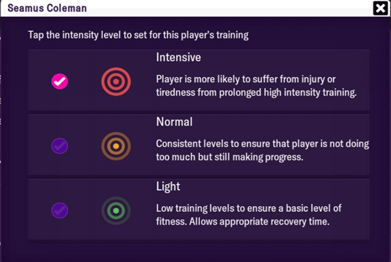 Bagian ini merupakan bagian di mana Anda bisa mengatur intensitas latihan dari setiap pemain Anda dalam skuad. Ada 3 jenis intensitas yang bisa Anda atur sesuai dengan kebutuhan Anda sebagai seorang manajer dalam melatih pemain di tim Anda.