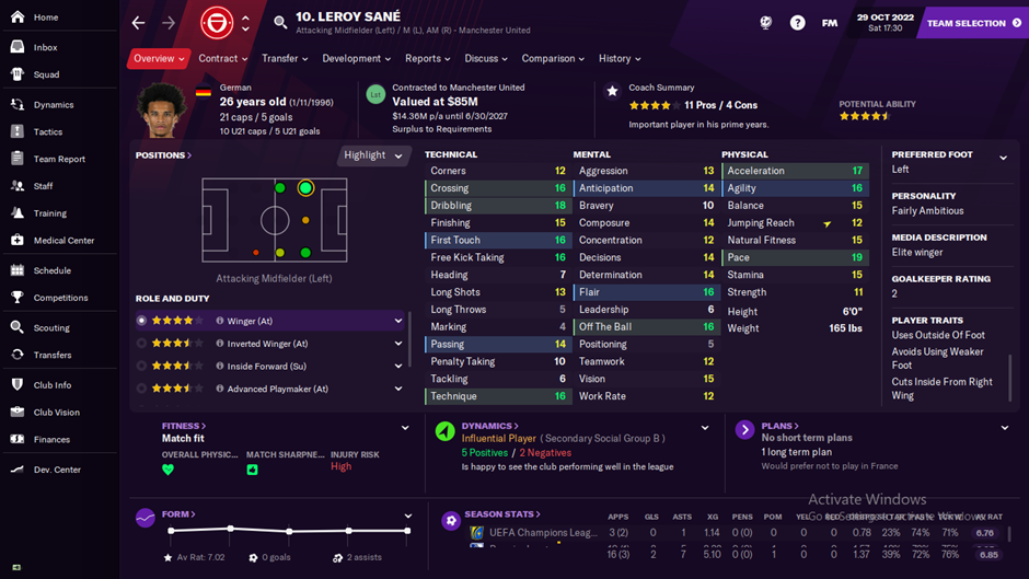Disini saya tempatkan Leroy sane sebagai inside forward dimana dia punya dribbling yang bagus serta akselerasi, agility dan pace yang sama baik sehingga trait ini akan digunakan untuk bisa mengcover sisi sayap yang bisa menjadi celah. Butuh pemain dengan kelincahan dan dribbling yang baik untuk ditempatkan di sisi ini.