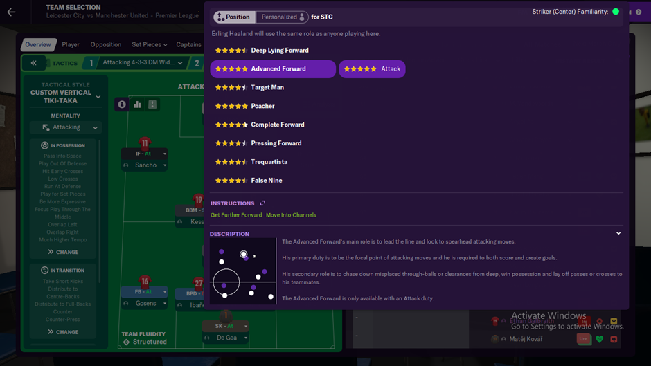Terakhir adalah role favorit saya yaitu Advance Forward. Dimana role ini mengharuskan pemain depan untuk mobile mencari ruang atau celah dan mendapatkan bola walau berada diantara pemain belakang lawan.