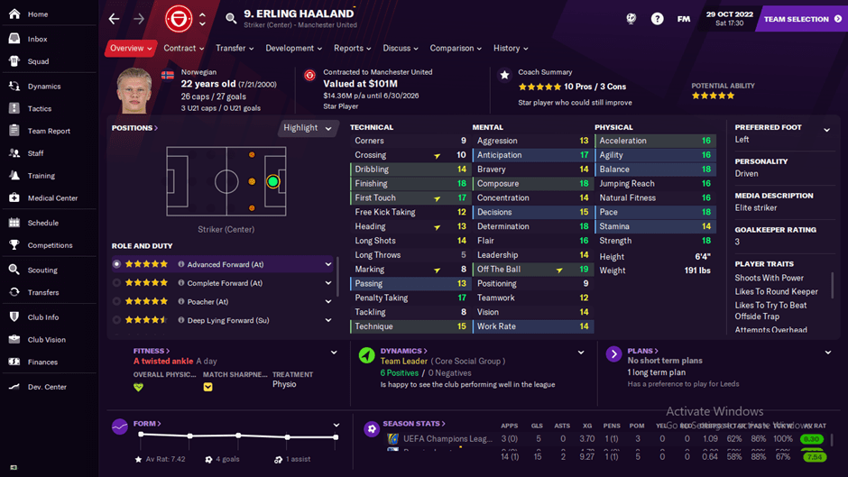 Jadi wajar jika suatu ketika dia berada diantara dua bek tengah atau menemukan celah di posisi yang sebenarnya sulit karena dia punya poin off the ball di angka hampir perfect 19. Kemudian karena AF adalah tipe striker yang mobile maka fisik harus bagus. Dan Cuma stamina saja yang kurang dari Haaland sementara atribut lainnya dia berada diantar angka 16.