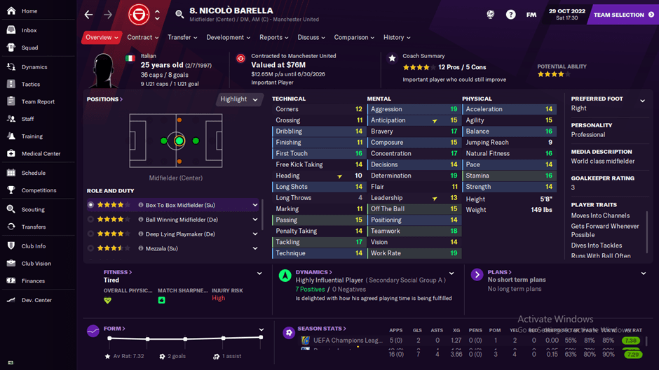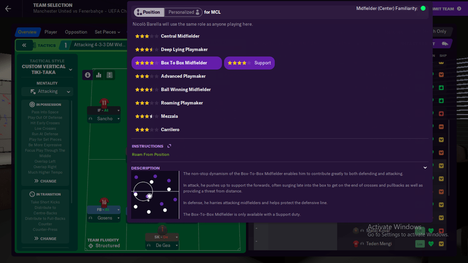 Bisa dilihat Barella role dan duty nya memang berfokus di box to box. Hal ini ditopang dengan fisik yang bagus. Bisa dilihat bahwa pemain dengan role ini harus punya balance yang bagus. Dan Barella punya itu. Stamina juga berada di angka 16. Dimana stamina sangat diperlukan oleh role ini dikarenakan bermain harus dengan daya jelajah yang bagus. Menyerang dan bertahan memerlukan stamina yang baik.