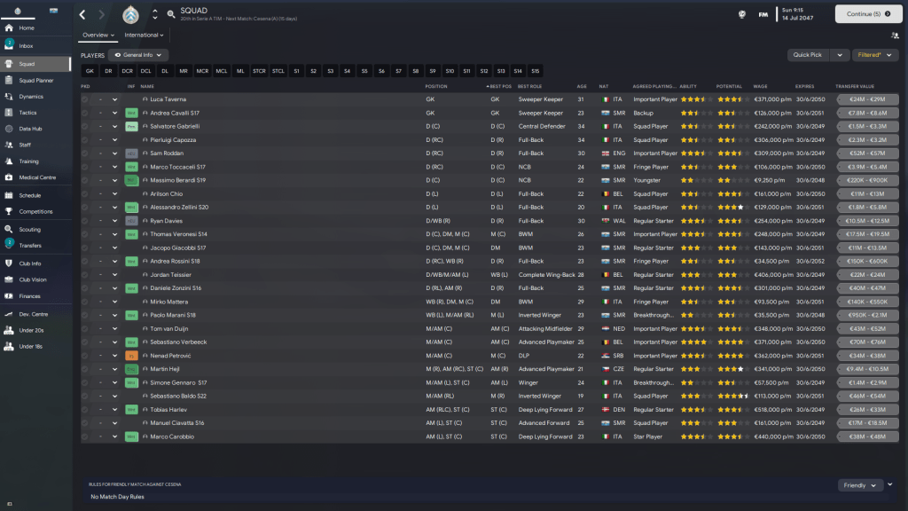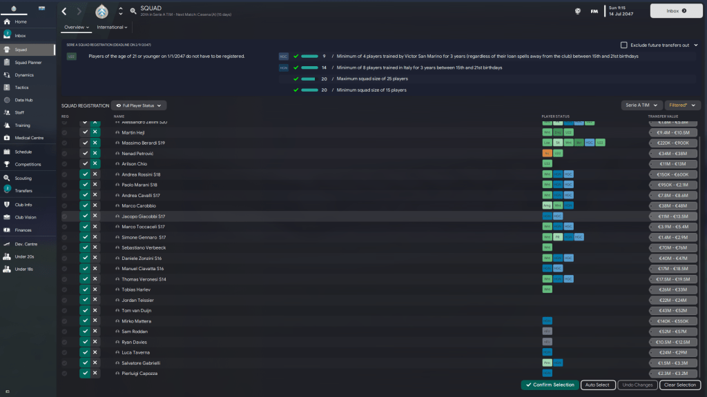 Di sini akan saya contohkan dengan skuad Victor San Marino yang saya latih di musim 2047/2048 di mana di skuat utama terdiri dari 26 pemain.