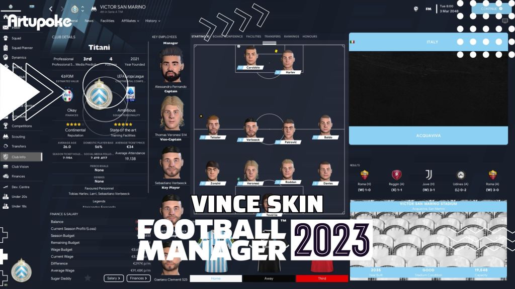 Setelah sukses dengan Vince Skin di Football Manager 2022, Vince_957 yang merupakan kreator skin di gim Football Manager ini merilis versi Vince Skin Football Manager 2023 dengan banyak perubahan yang membuat Artupoke.com menganugerahi menjadi skin terbaik di edisi Football Manager 2023. Adapun alasannya sebagai berikut: