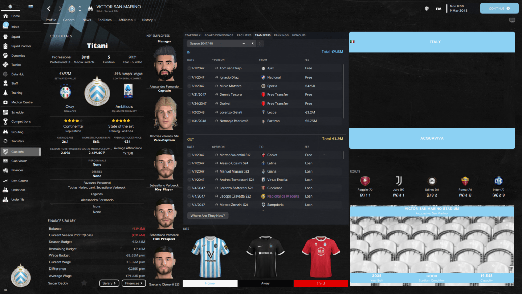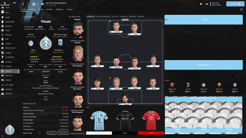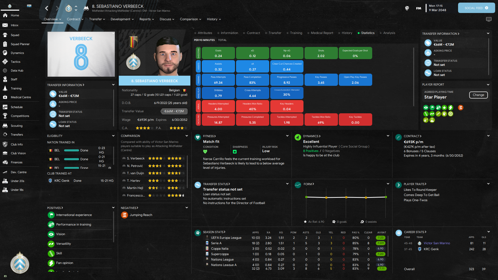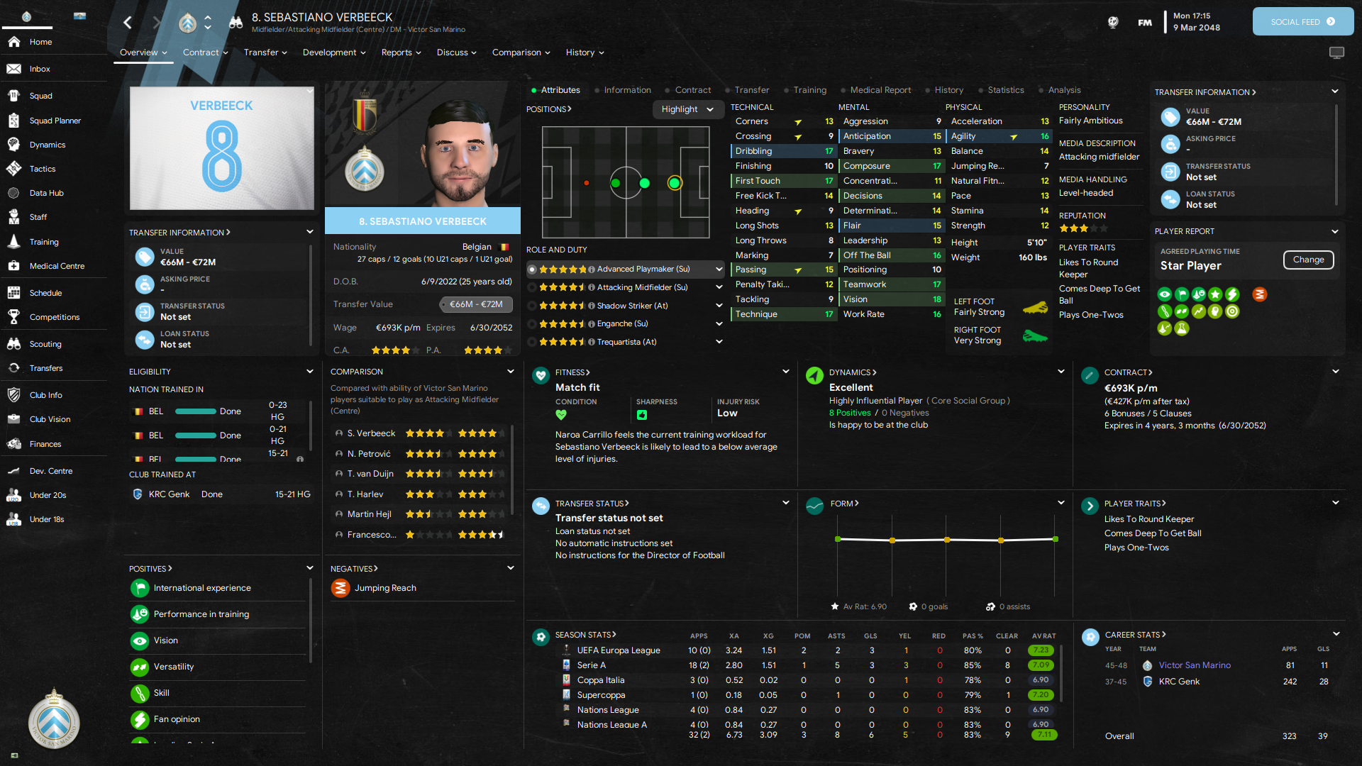 Tampilan menarik lainnya adalah tampilan dari profil pemain di mana di menu overview sudah dirangkum menjadi satu sehingga tidak perlu membuka profil contract, transfer, development, report, discuss, comparison hingga history.