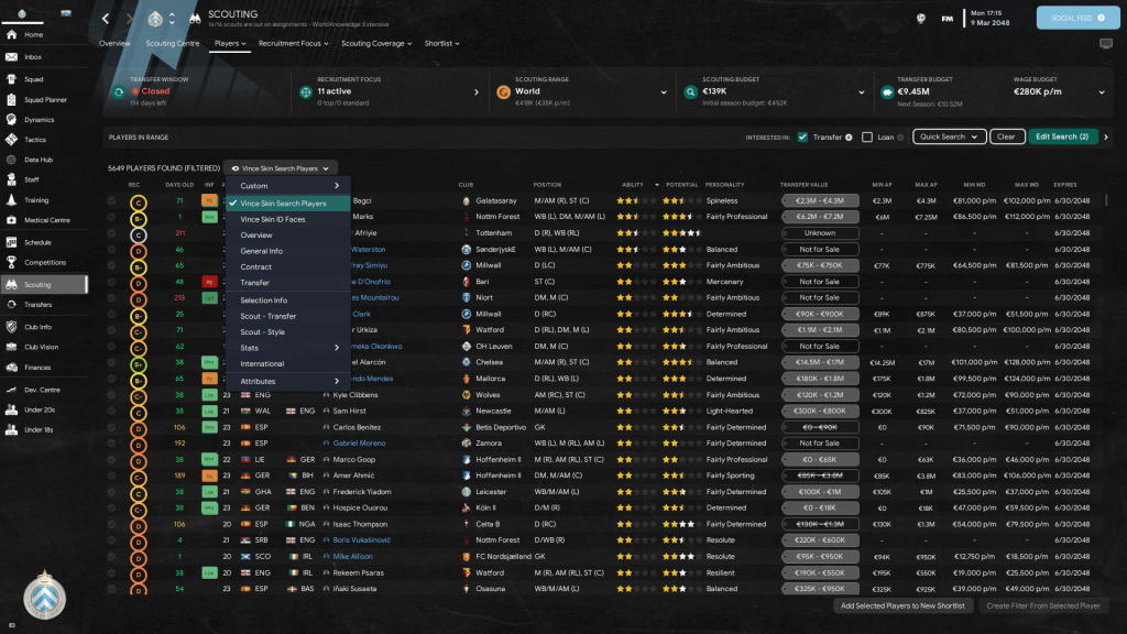 Untuk merekrut pemain dalam menu scout tercantum data yang lengkap seperti ability dan potential, transfer value, harga minimum dan maksimum serta masa kontrak.