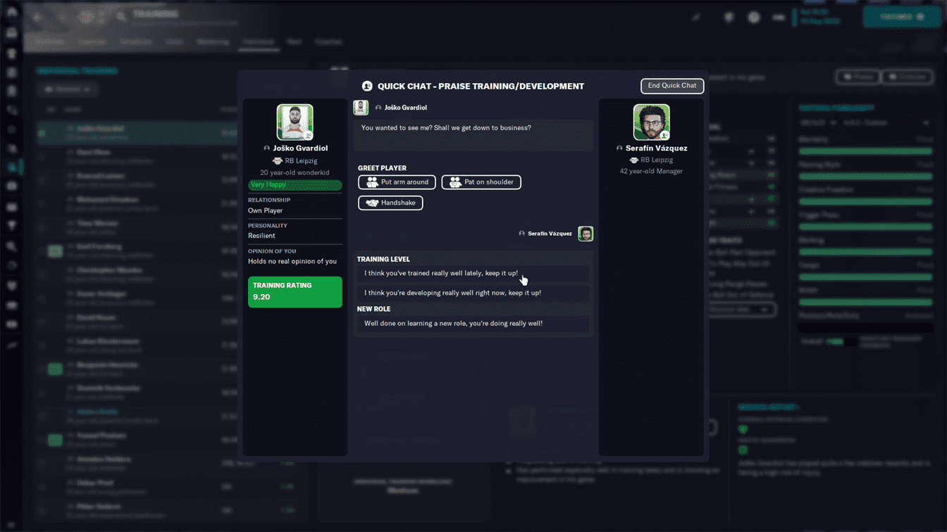 Siapa yang tidak senang dipuji? Siapapun pasti senang. Di game Footbal Manager biasanya kita menggunakan fitur quickchat untuk memuji pemain. Banyak hal yang bisa dipuji. Misalnya pemain mencetak gol setelah beberapa pertandingan mandul. Pujilah, itu akan meningkatkan moralnya. Pemain yang baru saja menjalani caps pertamanya di timnas, itu bisa menjadi peluang menaikan moralnya jika dipuji.