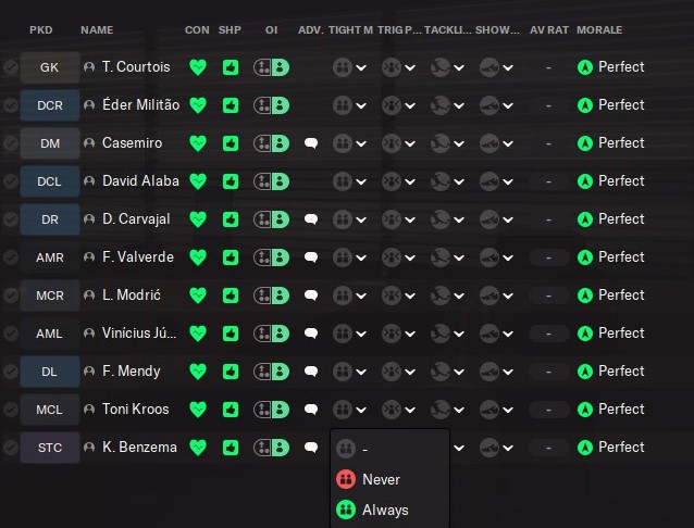 Untuk instruksi in possession, ZaZ Blue ini menggunakan attacking width fairly wide, ini cukup masuk akal karena 8 pemain akan bermain overload di area tengah. Approach play menggunakan play out of defense, dimana nanti Keeper dan kedua Center Back akan bermain bola-bola pendek. Crossing type menggunakan low crosses, karena kedua role Advanced Forward biasanya mengutamakan kecepatan dibanding fisik. Work ball into box efektif karena permainan berbasis overload dari tengah. Passing directness menggunakan slightly shorter dengan extremely high tempo, menggunakan sistem one touch pass seperti taktik-taktik download an lain yang biasa menjadi META (Most Effective Tactic Available), karena extremely high tempo sangat cocok untuk Match Engine Football Manager dengan kombinasi pemain-pemain yang tepat.