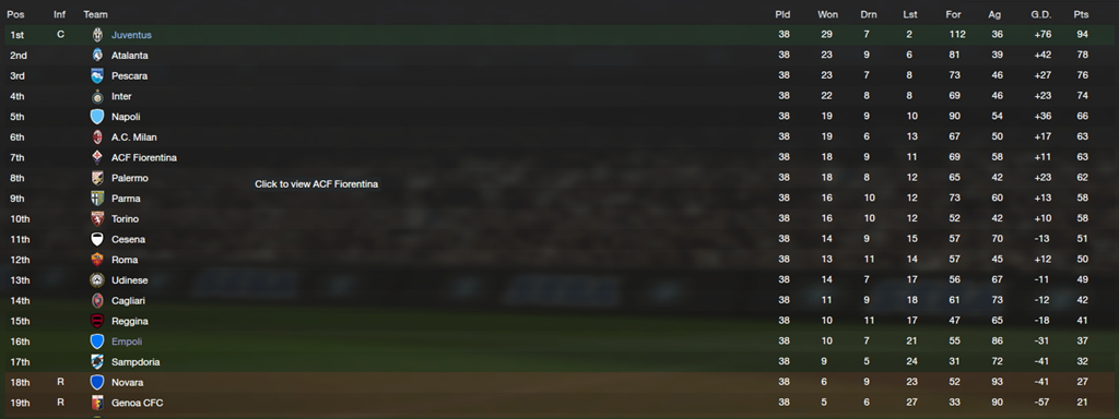 Mungkin hampir sebagian FMlovers yang sudah musim-musim era regen juga melihat fenomena yang sama. Tim tim papan atas sudah menjadi medioker, bahkan di savean saya, Lazio sudah degradasi. Atalanta dan pescara mendominasi bersama Juventus.