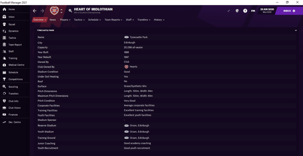 Klub yang berada di divisi kedua ini memiliki fasilitas latihan dan fasilitas pemain muda yang lumayan bagus untuk tim Divisi kedua. Selain anda memiliki misi untuk mengembalikan Heart Of Midlothian ke divisi keatas, fasilitas klub yang memadai bisa membantu anda untuk merealisasikan hal tersebut.