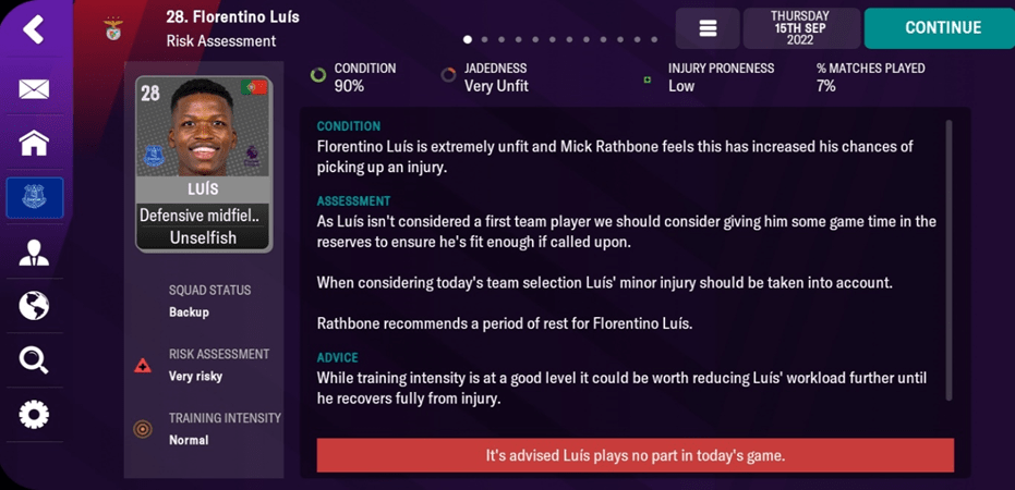 Anda juga bisa melihat keterangan lebih jelasnya dengan menekan tombol tanda seru (!) di bagian sebelah kanan dari ‘Ipr’. Di sini Anda akan diberikan oleh tim Physio berupa gambaran yang lebih lengkap lagi dari penilaian resiko cedera yang dialami oleh pemain Anda di tim seperti keterangan dari kondisi pemain, penilaian Physio Anda terhadap resiko cedera yang dialami oleh pemain, serta pemberian saran dari Physio Anda terhadap pemain yang sedang mengalami cedera tersebut.
