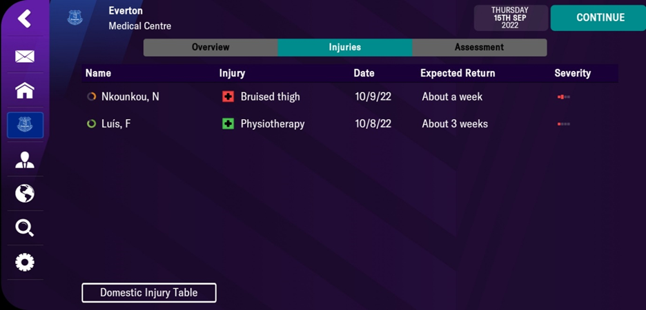 Oh iya, untuk bagian Domestic Injury Table ini Anda akan diperlihatkan berupa keterangan siapa saja pemain-pemain yang sedang cedera pada seluruh klub di kompetisi domestik.