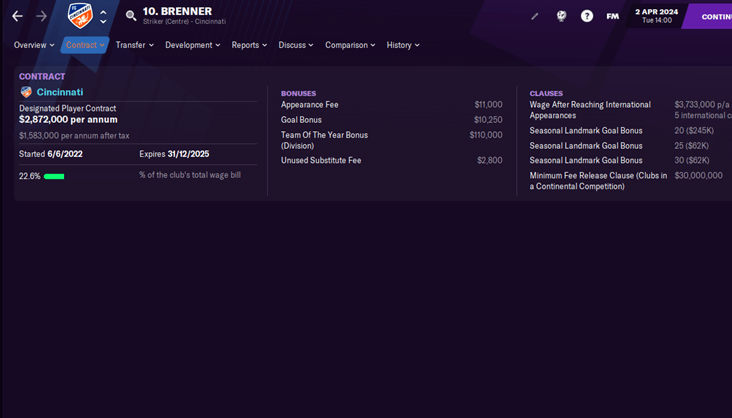 Setelah tampilan gaji menjadi tahunan, kemudian masuk ke registrasi dan ubah tampilan berdasarkan kontrak. Kita bisa melihat beberapa kolom seperti no pemain, agreed playing time, full/part-time (disini kita bisa melihat jenis kontrak pemain ada Designated Player, Senior, Senior Minimum dan Reserve seperti yang sudah dijelaskan dibagian kontrak), gaji dan waktu berakhirnya, cap impact, potential cap impact, guarantee contract, serta value.