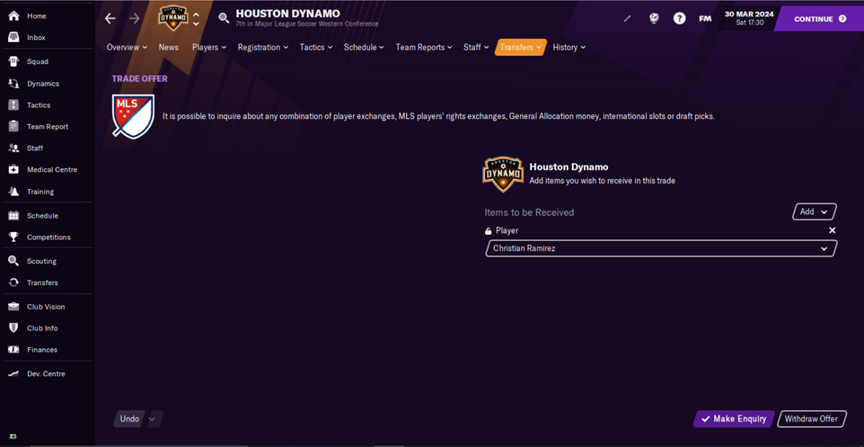 Nemu wonderkid dari Uruguay dan harganya murah, tapi pas registrasi kouta pemain internasional penuh, tenang tradeaja sama klub lain di MLS yang kouta internasionalnya masih kosong. Regulasi pembatasan kouta internasional di MLS gak seperti negara-negara Eropa yang statusnya tetap. Di MLS kalian bisa trade dengan klub MLS dengan jangka waktu mulai satu tahun hingga permanen sesuai dengan kesepakatan antara kedua pihak. Nah, untuk bagaimana teknis trade-nya akan dijelaskan di pembahasan Transfer dibawah hehehe.