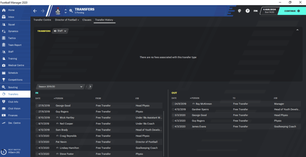 Langkah berikutnya adalah merekrut staff, merekrut staff adalah sebuah kewajiban meskipun tim masih berstatus semi-profesional. Sebagai klub semi-profesional maka saya tidak bisa muluk-muluk memilih staff mahal dan berkualitas, saya hanya bisa merekrut staff yang mumpuni dan mampu digaji sesuai dengan kemampuan tim. Akhirnya saya mampu merekrut 10 staff selama musim 2019/2020 dan melepaskan 4 staff secara free transfer.